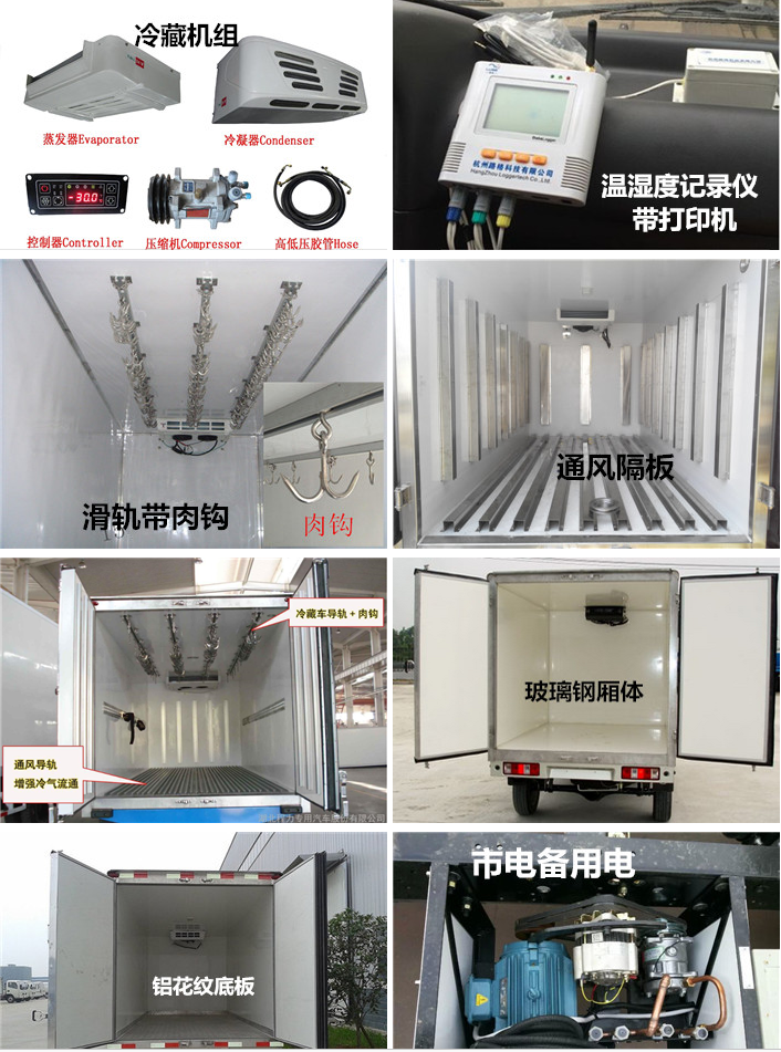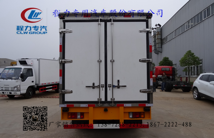 2.上裝配置:冷藏廂體內(nèi)部有效尺寸:長4.1米×寬1.74米×高1.75米,廂體蒙皮采用內(nèi)外玻璃鋼,隨客戶選擇內(nèi)置槽鋼焊接骨架或者玻璃纖維超輕高強(qiáng)度骨架,8cm厚聚氨酯發(fā)泡保溫層,不銹鋼包角,不銹鋼門框,不銹鋼門鎖件,花紋鋁底板,配后雙開門,可以選開側(cè)門,-5~-18度制冷機(jī)組可選。可以安裝肉鉤等內(nèi)部設(shè)施。